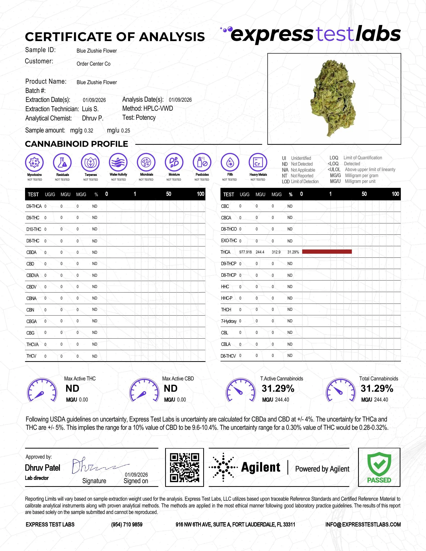 Your safety is our utmost priority. We ensure the superior quality of all our products, including Blue Zlushie THCA flower, by testing every batch through a third-party laboratory.