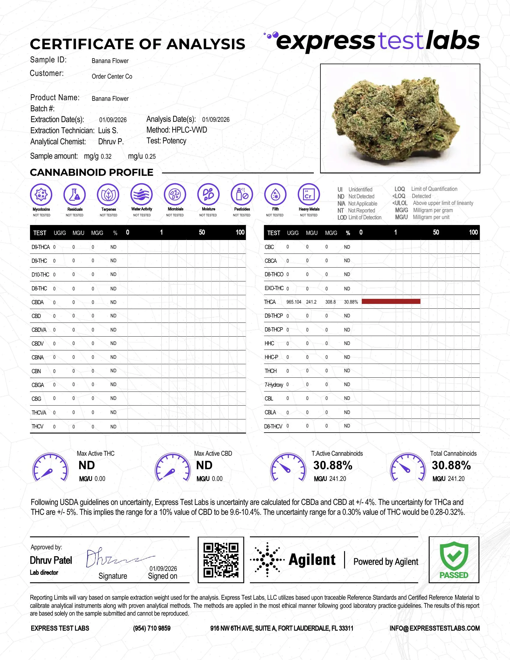 To ensure premium quality and safety, every batch of Banana THCA hemp flower undergoes rigorous third-party lab testing, meeting the highest industry standards.