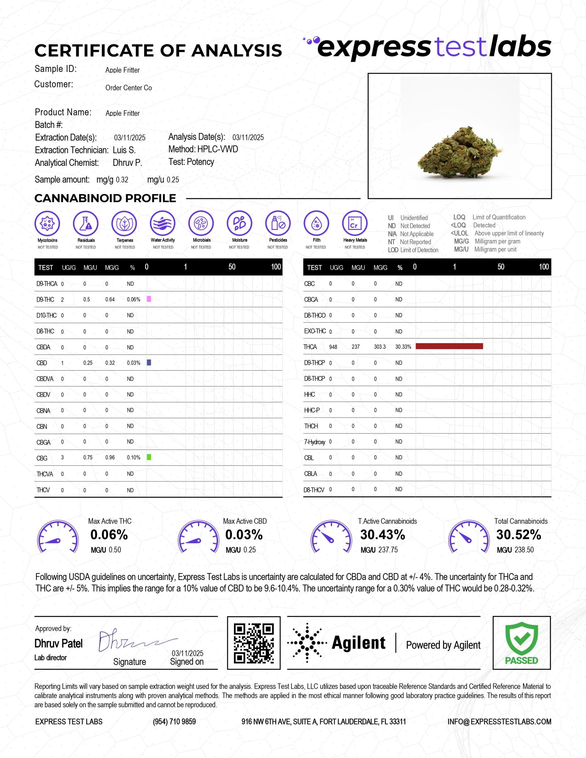 Your safety is always our top priority. We test every batch of Apple Fritter THCA hemp flower through independent labs to guarantee superior quality and purity.