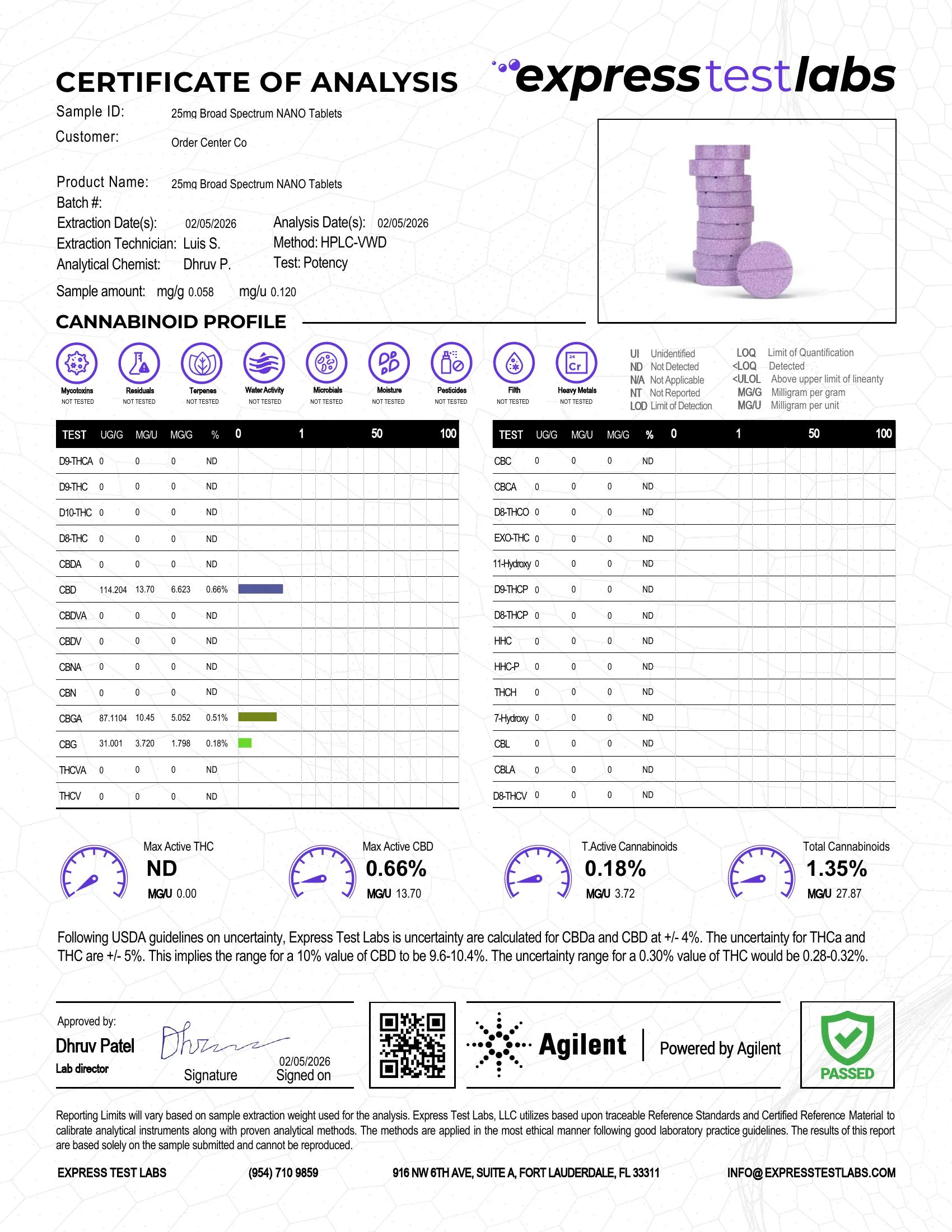 - Each tablet contains 25mg of Broad Spectrum CBD, offering non-intoxicating calm, everyday balance, and post-activity recovery you can count on.