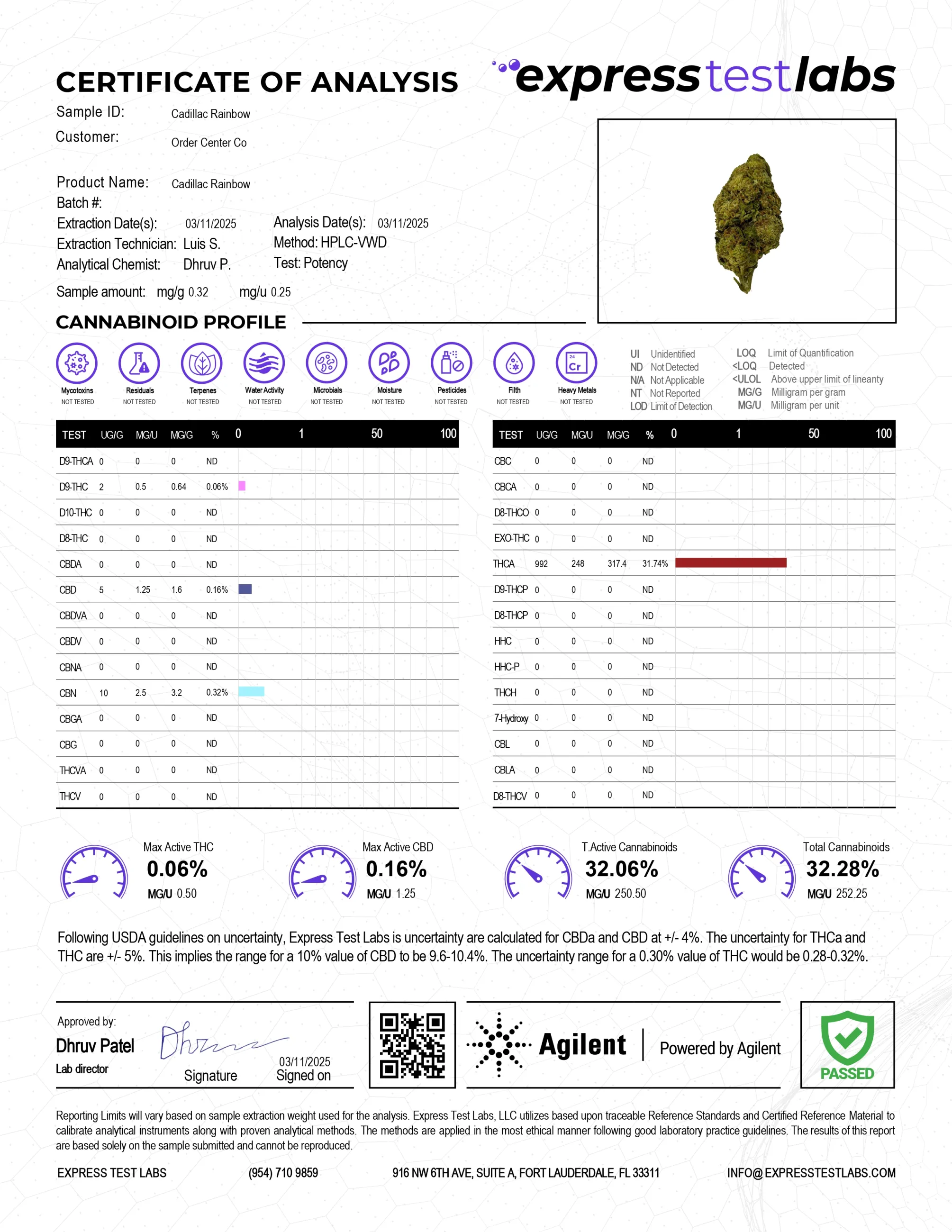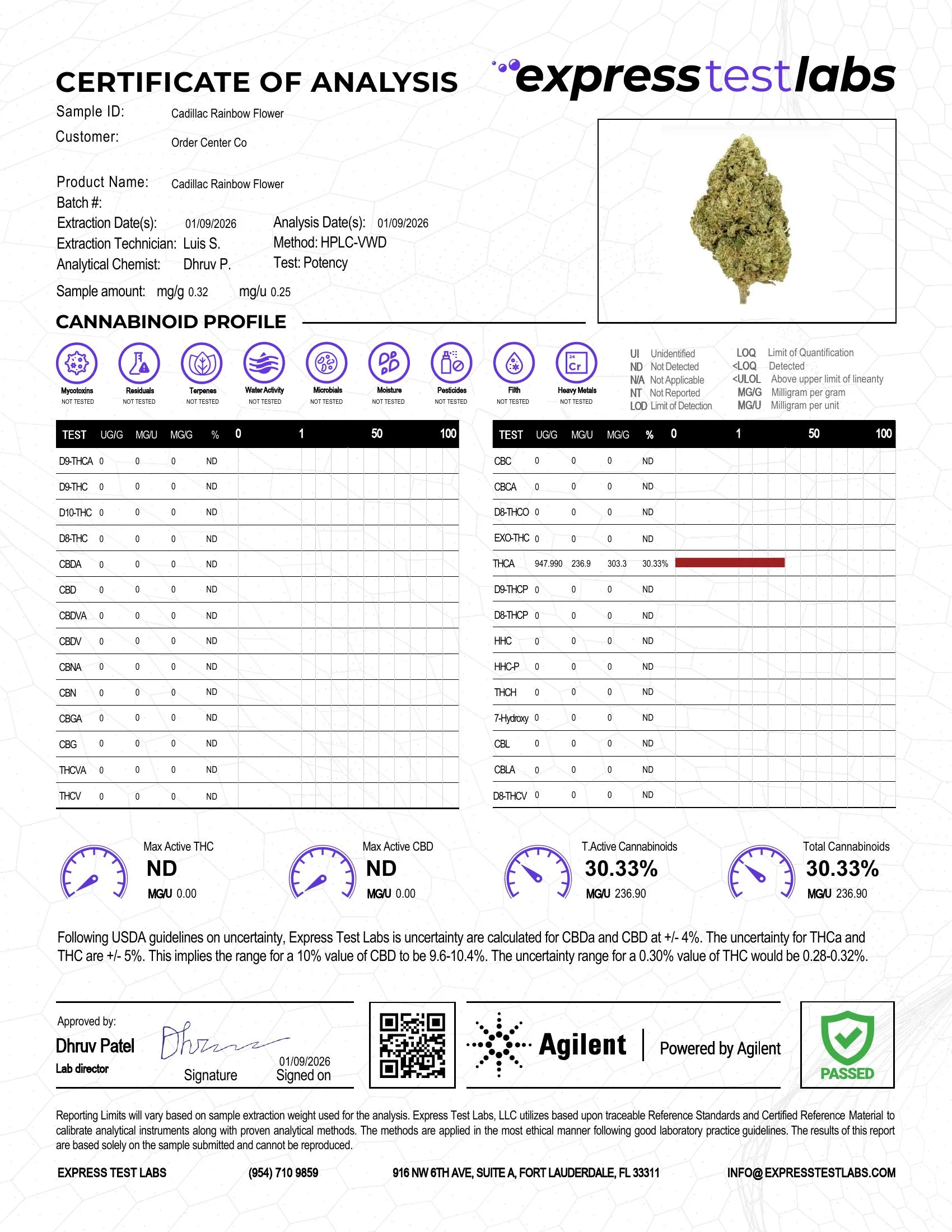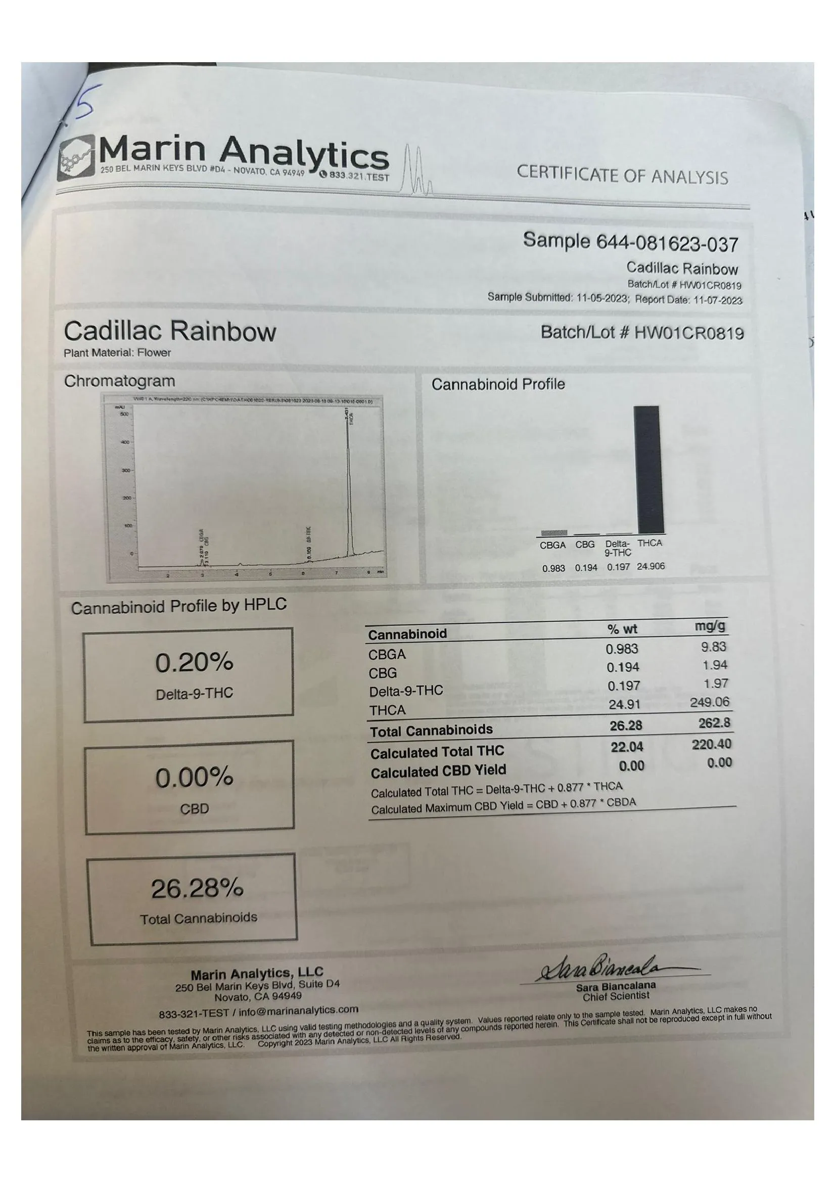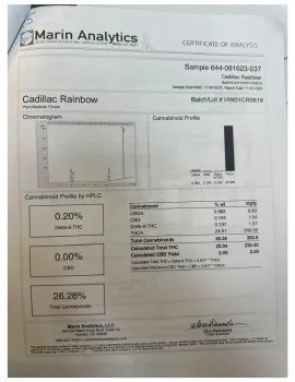 Your safety is our utmost priority. We ensure the superior quality of all our products, including Cadillac Rainbow THCA flower, by testing every batch through a third-party laboratory.