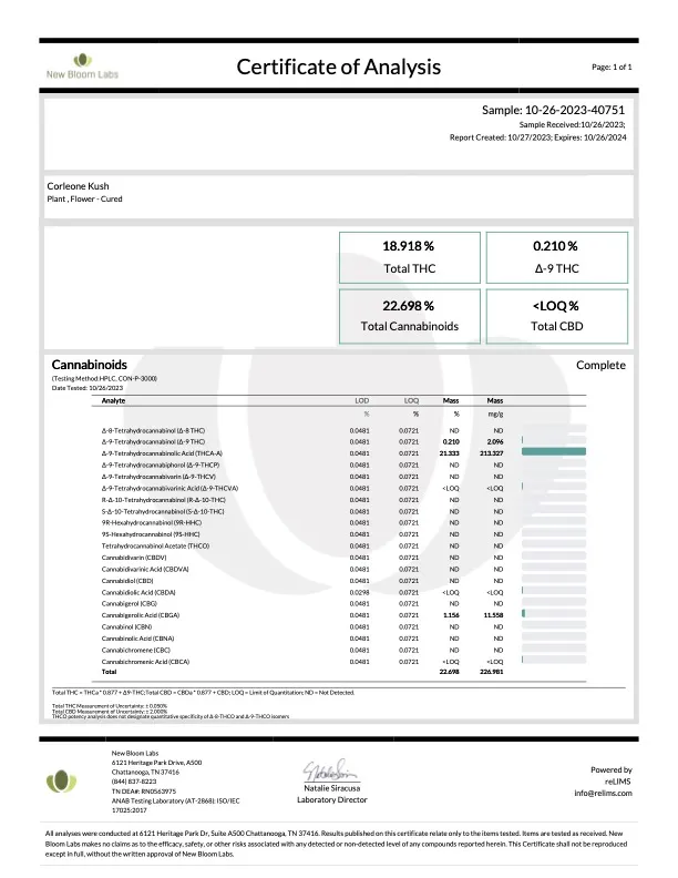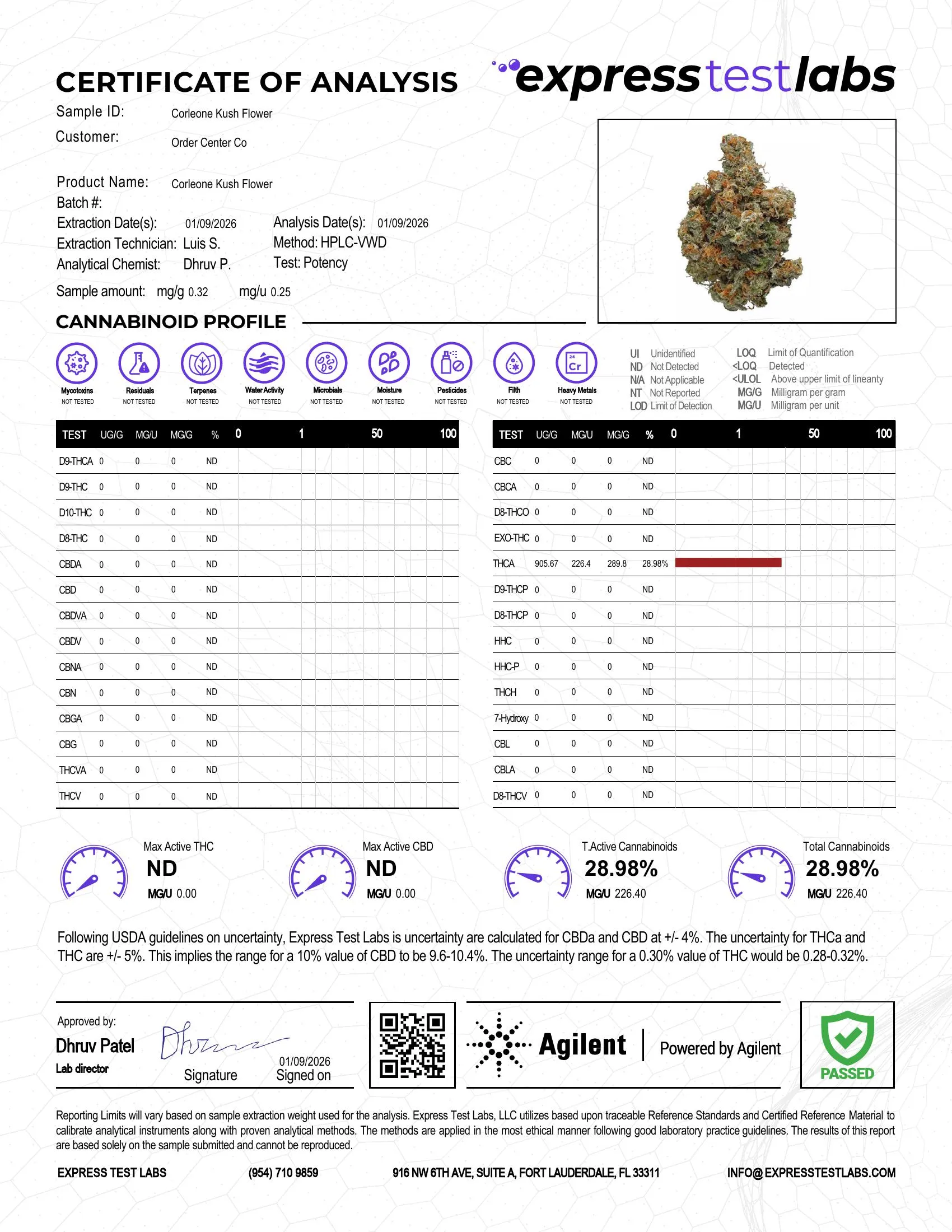 Your safety is our utmost priority. We ensure the superior quality of all our products, including the Corleone Kush THCA flower, by testing every batch through a third-party laboratory.