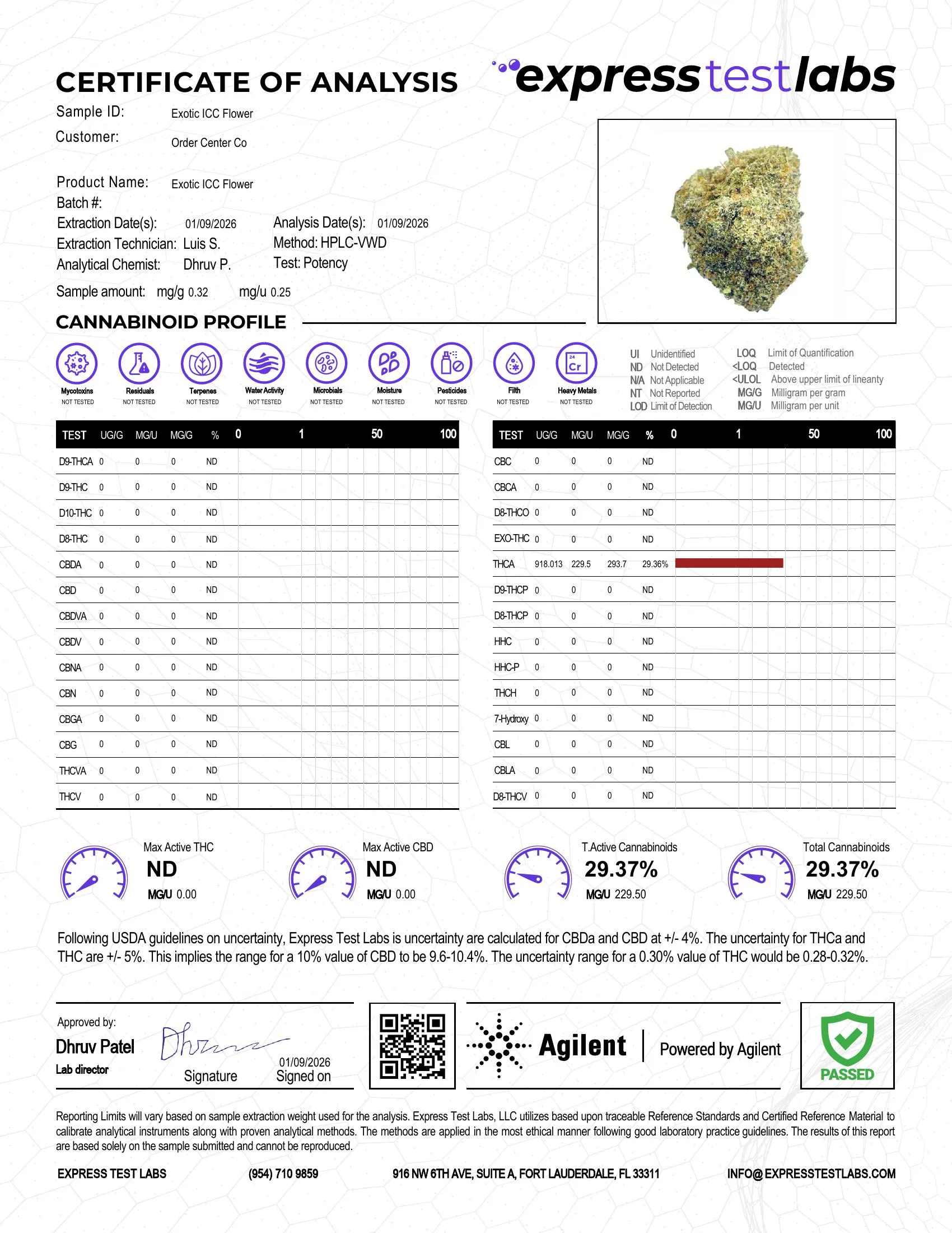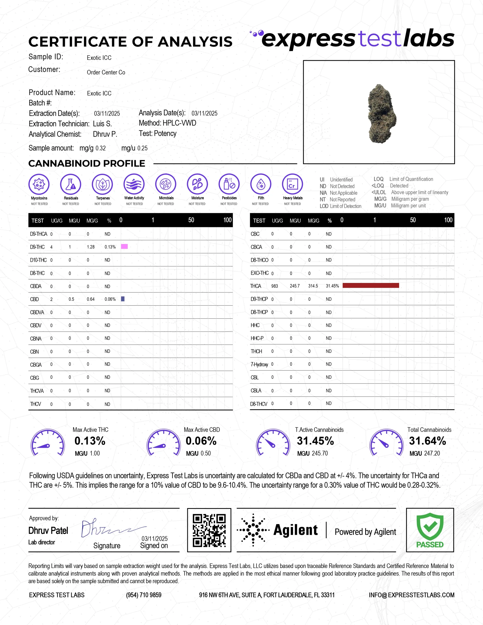 Committed to your safety, we ensure every batch of our Exotic ICC THCA hemp flower is rigorously tested by independent laboratories. This guarantees the highest quality and safety standards you've come to expect from our products.