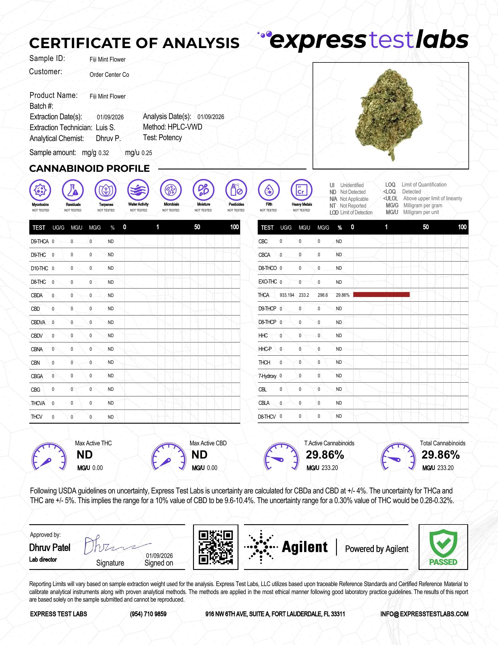 Your safety is our utmost priority. We ensure the superior quality of all our products, including Fiji Mint THCA flower, by testing every batch through a third-party laboratory.