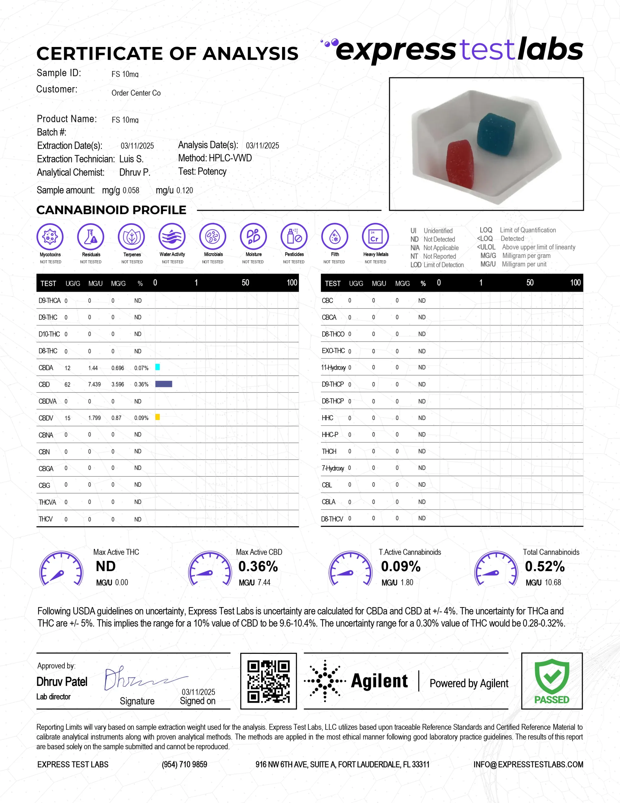 - Each gummy contains 10mg of Full Spectrum CBD, steady, gentle calm for everyday balance.
