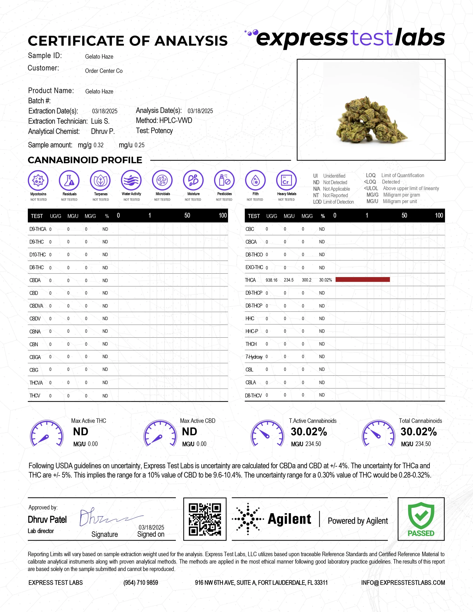We ensure premium quality by testing every batch of Gelato Haze THCA hemp flower in third-party labs, providing you with peace of mind and reliable results.