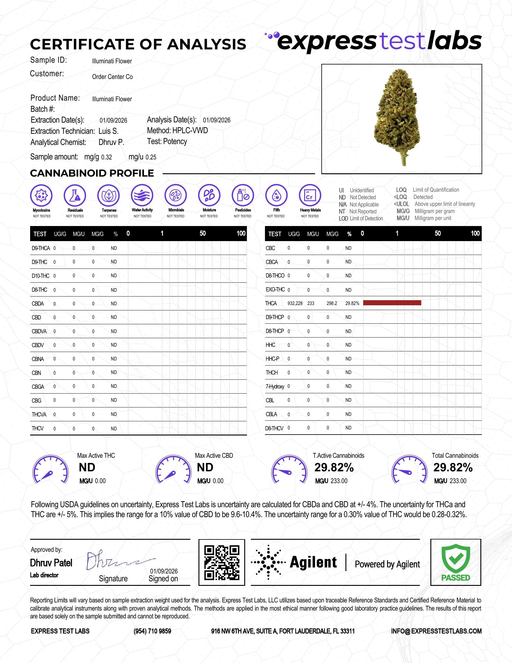 Your safety is our top priority. We guarantee the superior quality of all our products, including Illuminati strain THCA flower, by subjecting every batch to rigorous testing through a third-party laboratory.