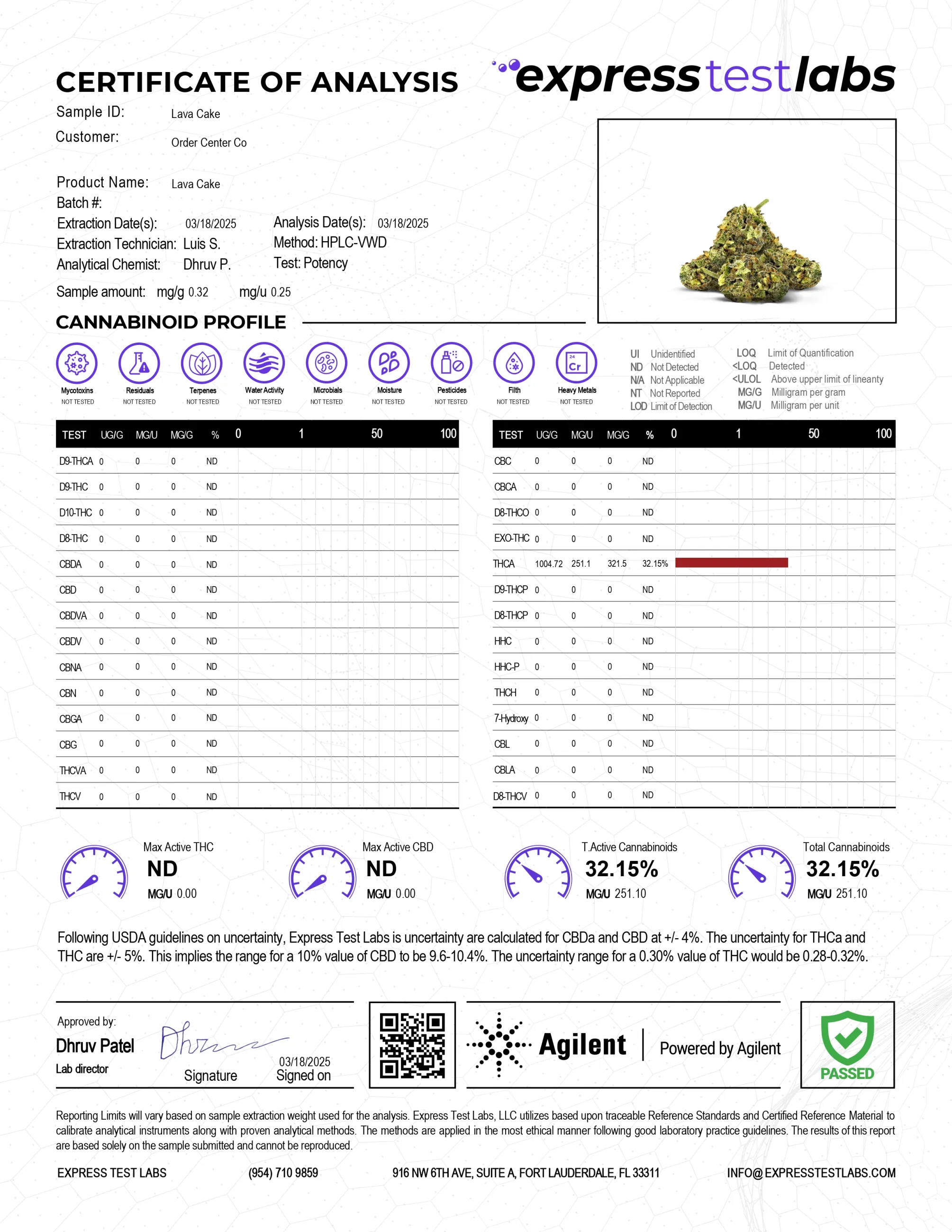 Your safety is our utmost priority. We ensure the superior quality of all our products, including Lava Cake THCA flower, by testing every batch through a third-party laboratory.