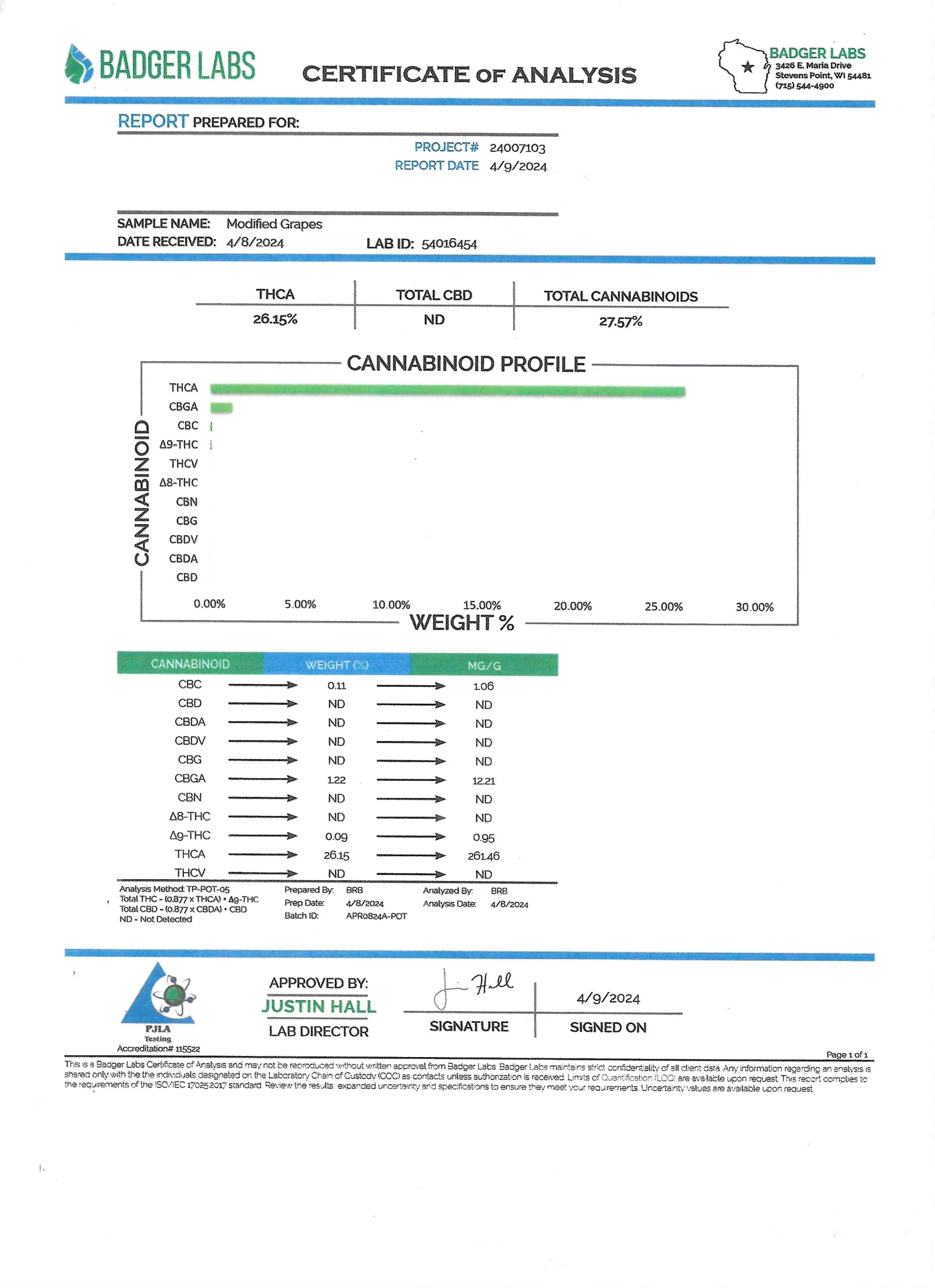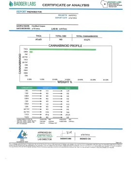 Your safety is our utmost priority. We ensure the superior quality of all our products, including Modified Grapes THCA flower, by testing every batch through a third-party laboratory.