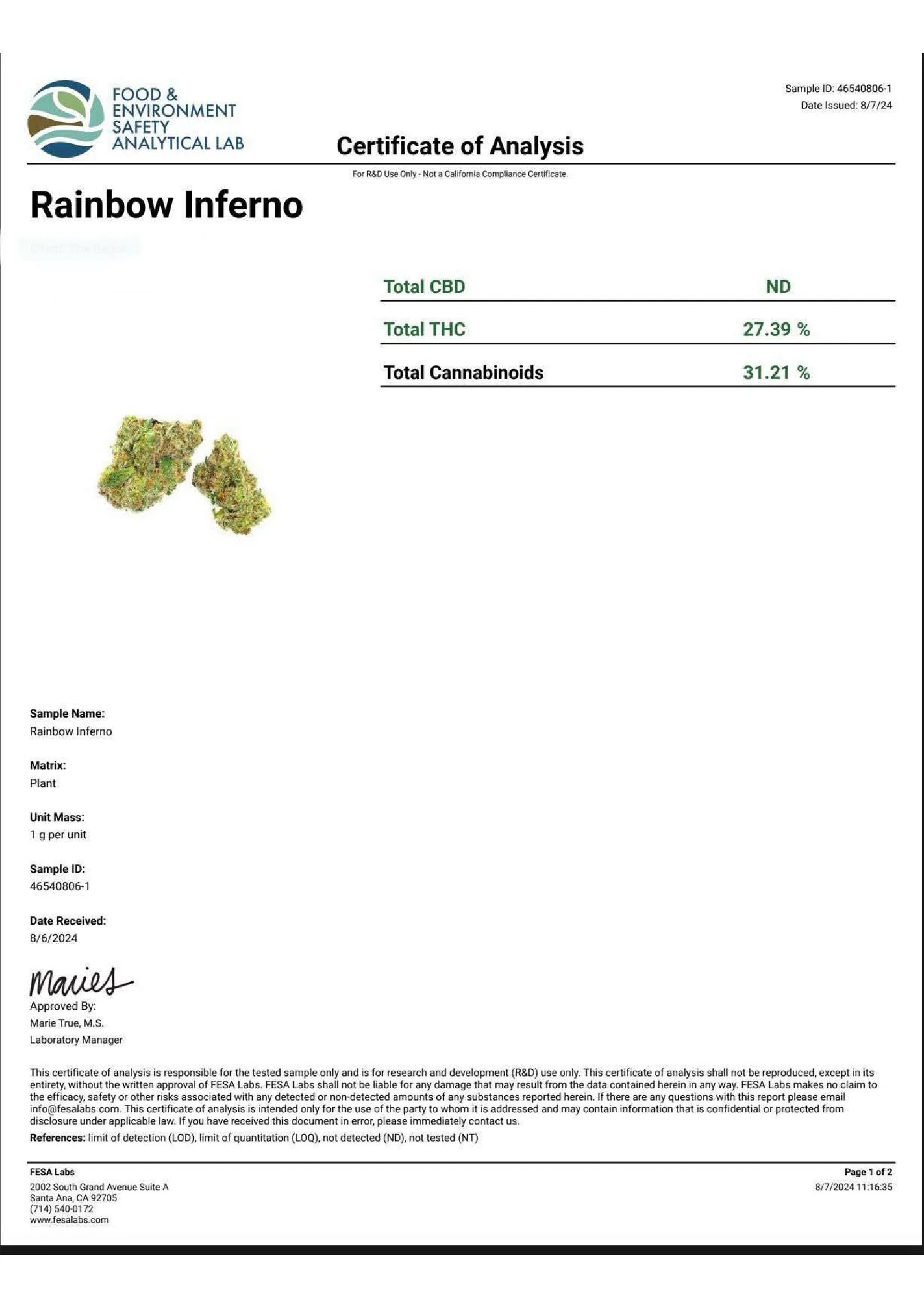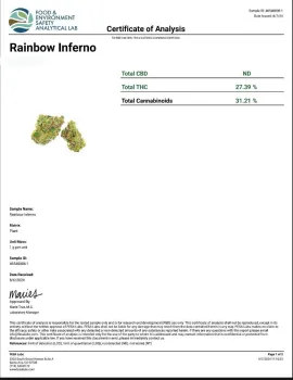 As a hybrid, Rainbow Inferno aims for a versatile experience—great for winding down after a busy day or enhancing creative downtime—while maintaining a clear, composed vibe. Expect a smooth burn and a clean finish that invites an unhurried pace. Potency-forward enthusiasts will appreciate its robust profile, with THCA testing around 23.5% (total THC approximately 23.8%), delivering depth without sacrificing balance.