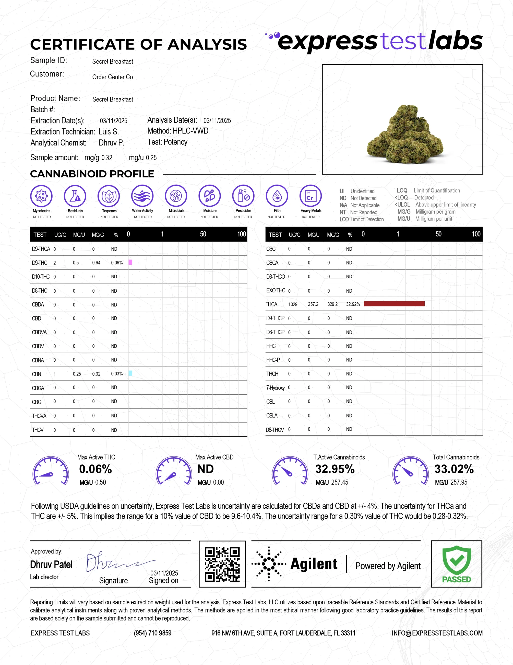 Your safety is our utmost priority. We ensure the superior quality of all our products, including Secret Breakfast THCA flower, by testing every batch through a third-party laboratory.
