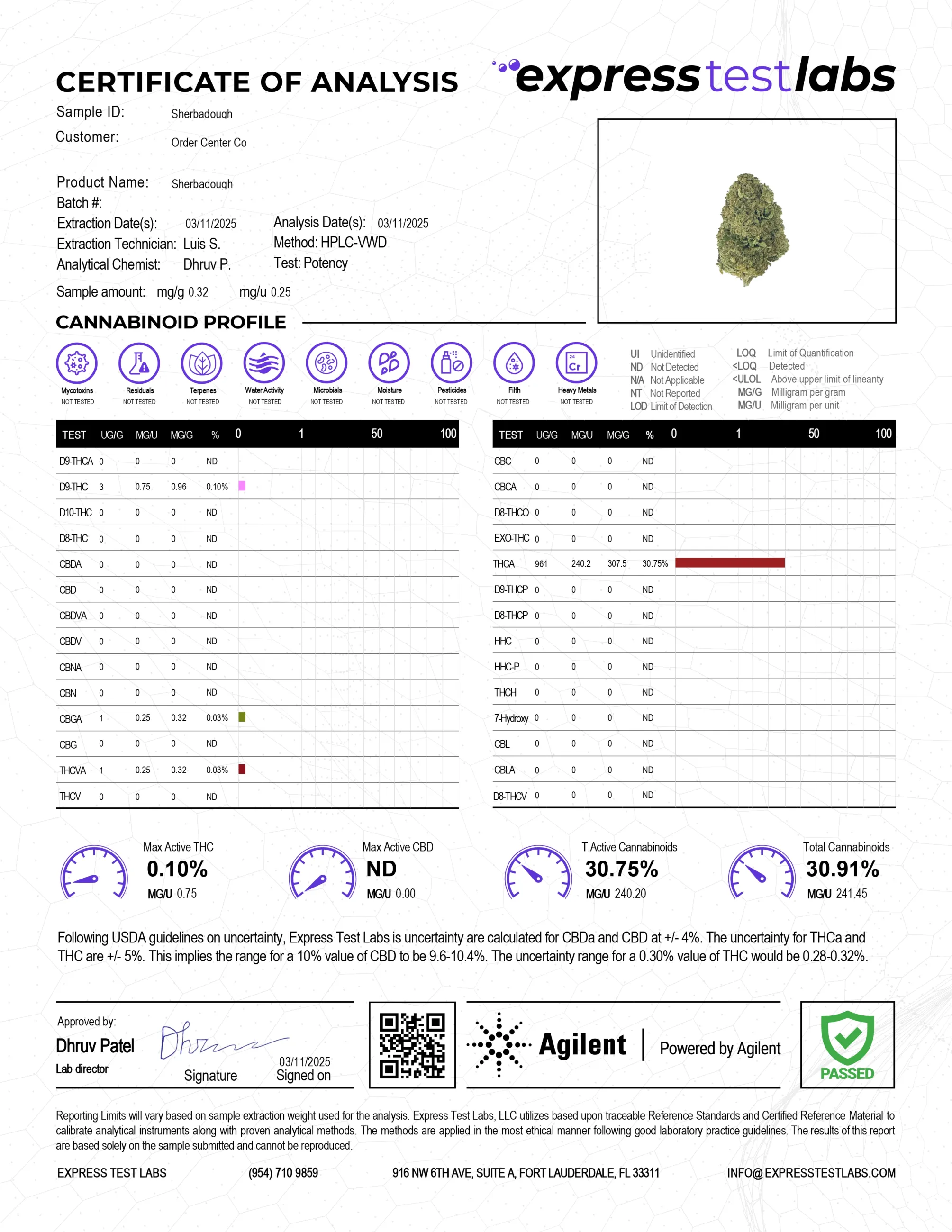 Your safety is our utmost priority. We ensure the superior quality of all our products, including Sherbadough THCA flower, by testing every batch through a third-party laboratory.
