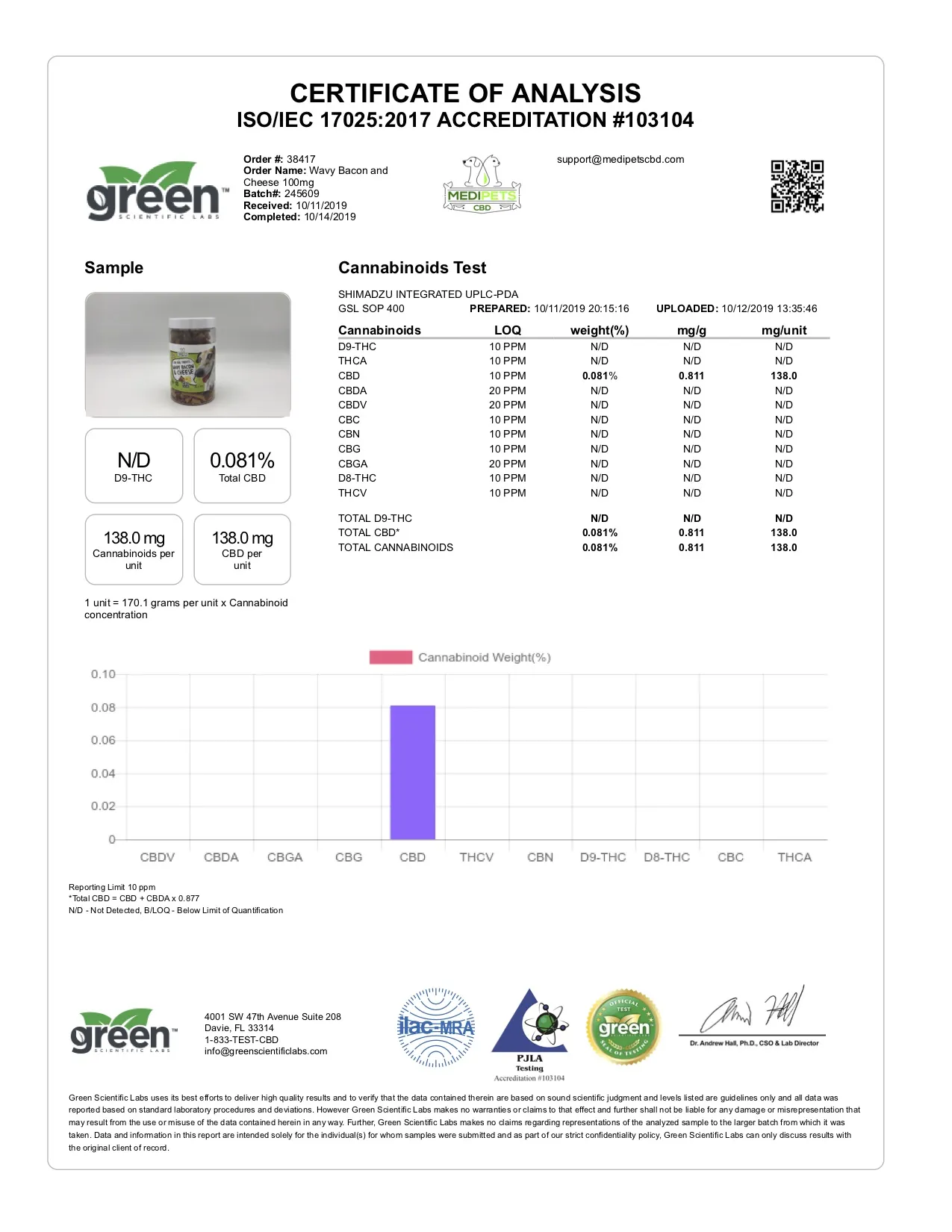 Cannabidiol (CBD), Wheat flour, Beef by-products, Corn Syrup, Glycerin (derived from vegetable oil), Pregelatinized Corn flour, gelatin, Vital Wheat Gluten, Chicken Fat (preserved with mixed Tocopherols), Bacon, Salt, Phosphoric Acid, Natural Smoke flavour, Potassium Sorbate (preservative), Calcium Propionate (preservative), Lecithin, Artificial Colors (Caramel, Red #40, Yellow #5, Yellow #6), Dried Cheese Powder.